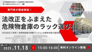 三和建設は、11月18日(火)に物流・倉庫・製造業向け 第19回 RiSOKOオンラインセミナー『専門家が徹底解説!法改正をふまえた危険物倉庫のラック選び』を開催します。 今年5月の法改正により、危険物倉庫 ...
