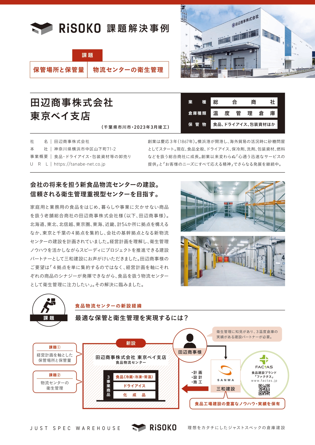 家庭用と業務用の食品をはじめ、暮らしや事業に欠かせない商品を扱う老舗総合商社の田辺商事株式会社(以下、田辺商事)は北海道、東北、北関東、東京、東海、近畿計54か所に拠点を構える大商社。東京ベイ支店では食品の基幹拠点として新食品物流センターの建設を計画されていました。