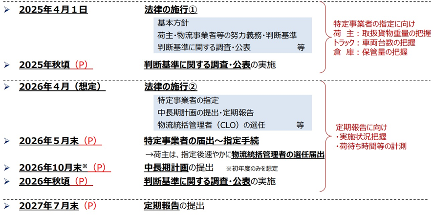 今回の法改正により、これまで努力義務とされていた事項の一部が、実効性のある規制的措置に強化されます。まず、2025年4月からすべての物流事業者に対する努力義務が課せられ、そして第二弾として2026年4月(予定)より特定事業者に対する義務が課されるなど、段階的に規定が適用されることになっています。