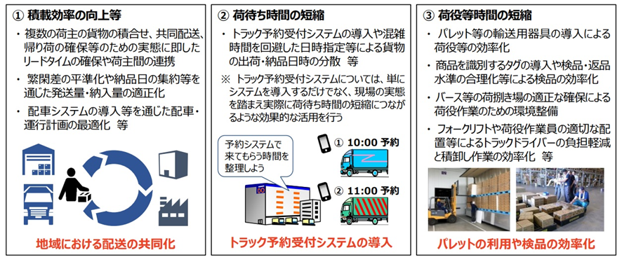 荷主・物流事業者などが講ずべき措置については、どんなことでも自由に実施すれば良いというわけではなく、特に以下の3つの業務に絞り、効率化のための改善が求められます。